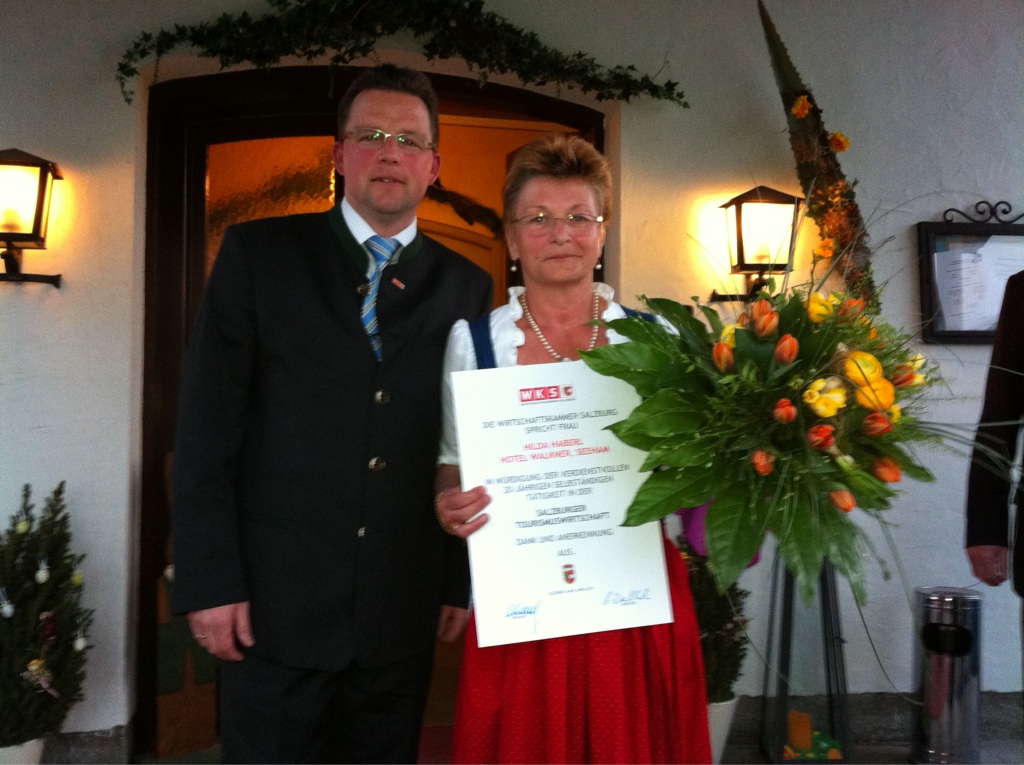 Frau Haberl wurde von Spartenobmann Albert Ebner für Ihre 20jährige Selbstständige Tätigkeit geehrt. Sie hat das Hotel Walkner in Seeham an Ihren Sohn Herrn Haberl Jun. Übergeben.